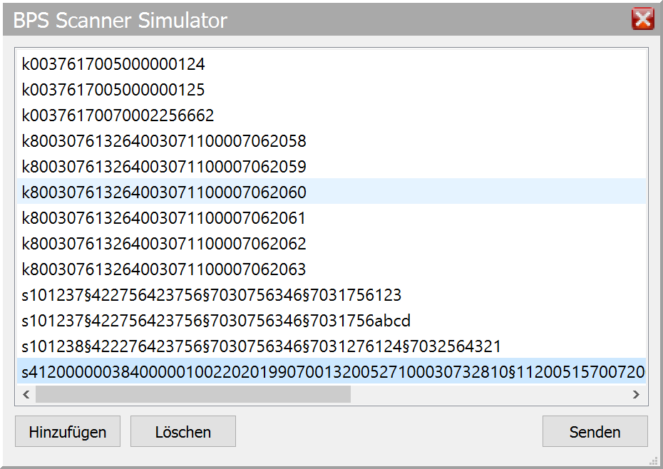 | Beschreibung | Der Scanner-Simulator unterstützt jetzt Barcodes bis 10'000 Zeichen, damit auch grössere 2d-Codes simuliert werden können (z.B. Datamatrix). Das Paragraphen-Zeichen § kann jetzt als Platzhalter für den FNC1 Code (ASCII Steuerzeichen GS) eingesetzt werden. Ein FNC1 Code wird bei GS1 verwendet um ein Feld mit variabler Länge abzuschliessen wenn nicht die volle Länge verwendet wird und es nicht das letzte Feld ist. | ||||