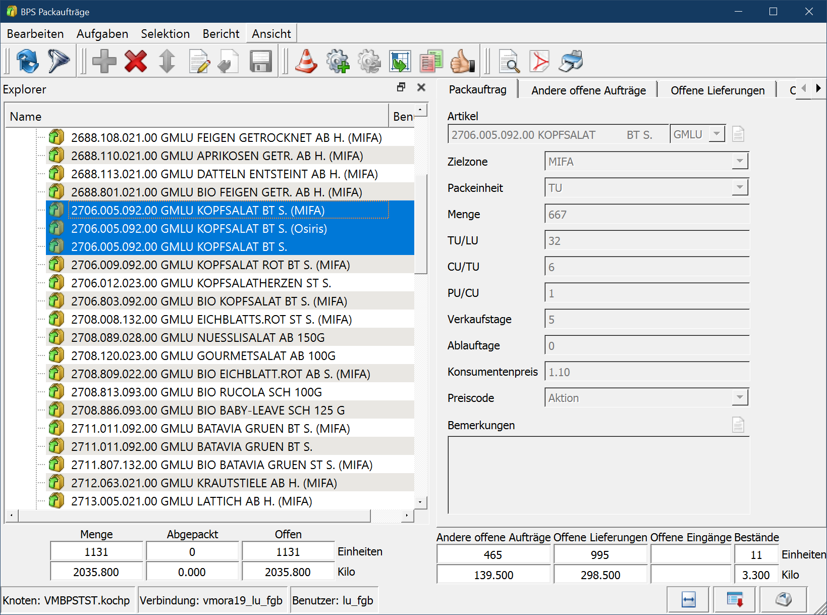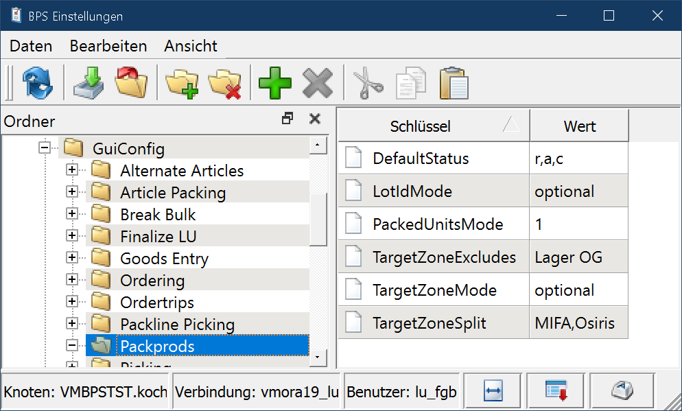 | Beschreibung | Bei der Generierung der Packaufträge können diese nach Zielzonen separiert werden. Ebenso ist es möglch, bestimmte Zielzonen ganz auszuschliessen. Um die Optonen zu aktivieren gibt es neue Parameter in den Einstellungen unter Central System Settings/GuiConfig/Packprods: Bei «TargetZoneSplit» sind die Zielzonen anzugeben für die separate Packaufträge generiert werden sollen. Für alle nicht aufgelisteten Zonen werden die Packaufträge ohne vordefinierte Zielzone generiert. Werden neue Packaufträge aus den Auftragstouren generiert, so werden für die Mengen der entsprechenden Kommissionierzonen separate Packaufträge erzeugt. Bei «TargetZoneExcludes» sind jene Zielzozen anzugeben welche bei der Auftragsgenerierung ganz auszuschliessen sind. Die Mengen dieser Zielzonen werden also nicht eingerechnet. Diese Einstellung hat Vorrang gegenüber TargetZoneSplit. Im Beispiel ist das «Lager OG» weil dort manuelle Pickaufträge im Dienste des Osiris Automaten kommissioniert werden. Diese Mengen sind also bereits bei Osiris eingerechnet und würden in den Packaufträgen doppelt gezählt, wenn die Zone nicht ausgeschlossen wäre. Bei beiden Einstellungen sind die gewünschten Zonennamen jeweils als Liste durch Komma getrennt einzugeben. In den Packaufträgen sind gibt es ein neues Feld «Zielzone» mit welchen die Aufträge unterschieden werden. Im folgenden Beispiel wurden für «KOPFSALAT BT S.» sogar 3 Packaufträge erzeugt, je einer für MIFA, für Osiris sowie ohne Zielzone für «restliche Zonen»: Lässt man «TargetZoneSplit» leer, so wird nur ein Auftrag ohne vorgegebene Zielzone erzeugt, man hat dann dieselbe Situaton wie bisher. Es wird dann also nur ein Packauftrag ohne Zielzone erzeugt. | ||||