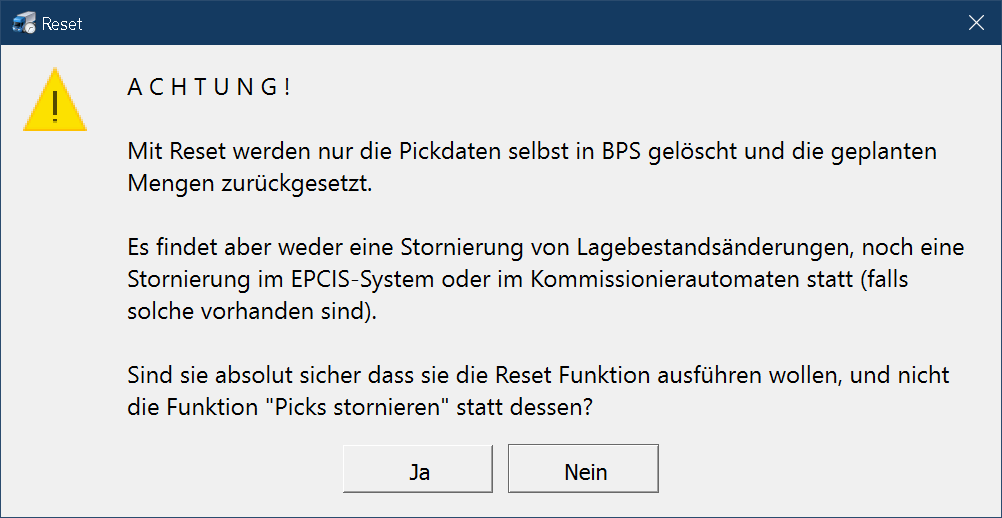 | Zusammenfassung | 0000718: Neue Funktion «Picks stornieren», Hinweis bei «Reset» | ||||