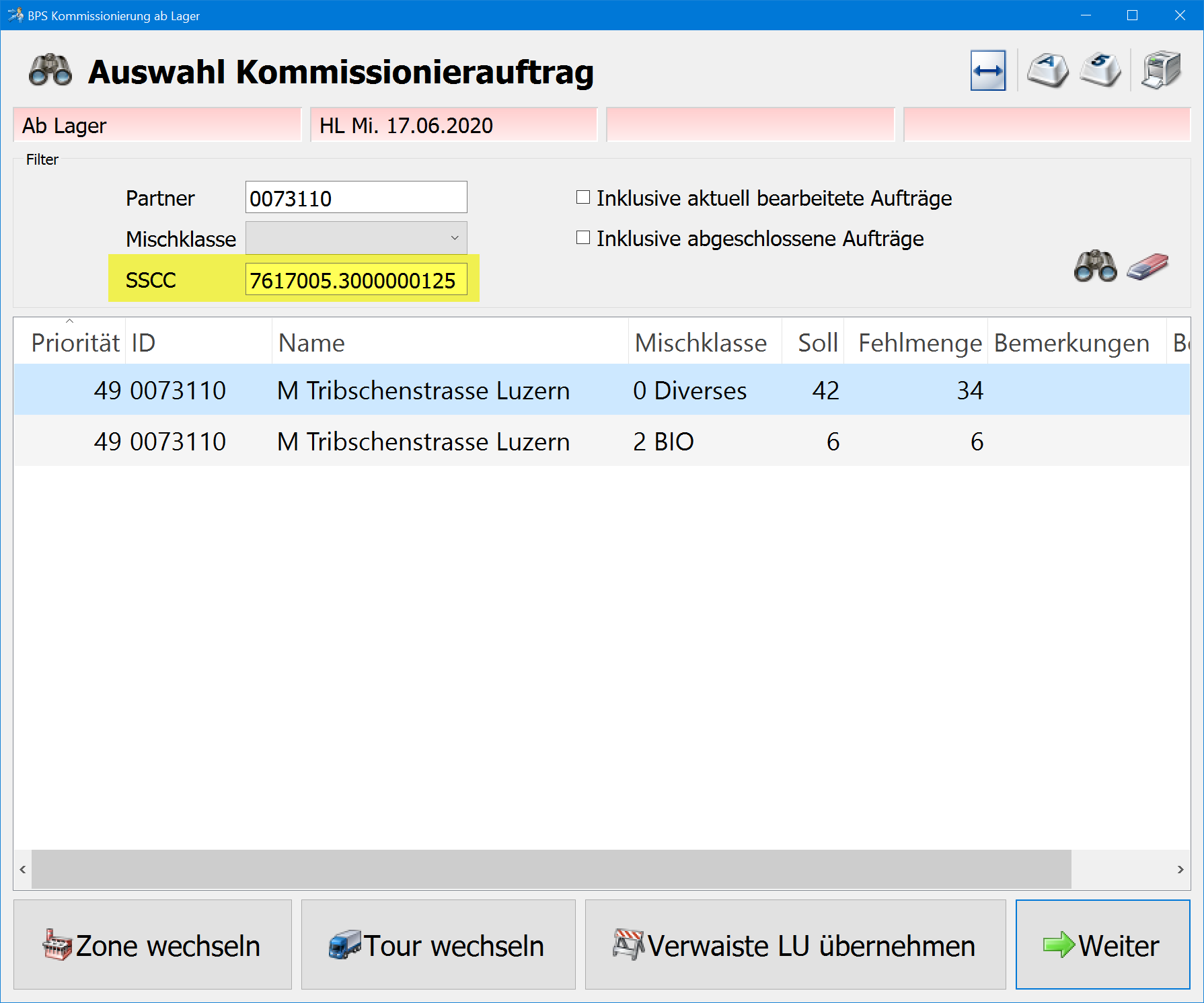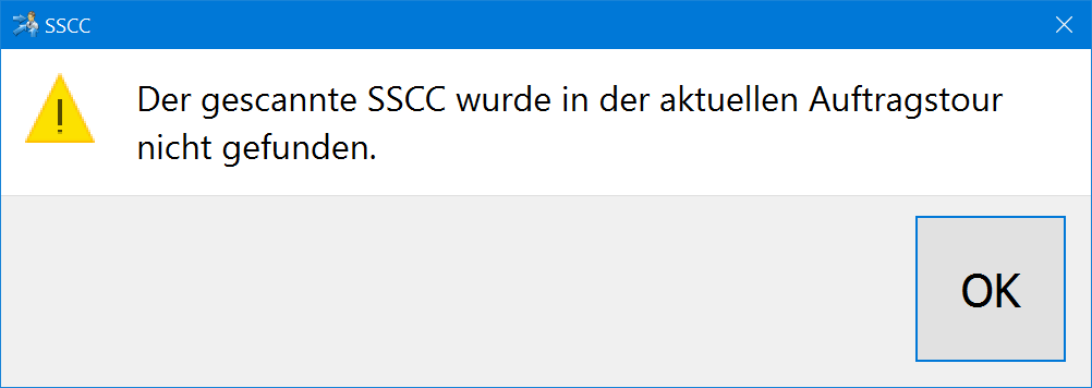 | Beschreibung | Bei der Kommissionierung ab Lager ist es jetzt möglich, den SSCC einer bestehenden Palette zu scannen um das Picking auf dieser Palette fortzusetzen: (Bild 1) Das neue Eingabefeld «SSCC» ist «Read-Only» und kann nur durch Scannen eines SSCC Barcodes befüllt werden. Nach dem Scannen wird der SSCC in den Pickdaten der aktuellen Tour gesucht und im Erfolgsfall die ID des betreffenden Partners im Filter eingetragen und dessen Aufträge abgerufen. Ist genau ein Auftrag für diesen Partner offen, so wird dieser sofort zur Kommissionierung aufgerufen. Andernfalls werden die offenen Pickaufträge des Partners in der Liste unten angezeigt, und man kann auswählen mit welchem Auftrag man die Palette fortsetzen will. Wird der SSCC in der aktuellen Tour nicht gefunden, so wird das als Meldung angezeigt: (Bild 2) Beim ersten LU-Abschluss innerhalb des Auftrags werden die gepickten Mengen mit der gescannten SSCC verbucht. Wird die Kommissionierung danach im Auftrag fortgesetzt, so werden die folgenden Pickmengen auf eine neue SSCC gespeichert. Alternativ kann man den Auftrag natürlich unterbrechen und eine weitere SSCC scannen um die restlichen Picks auf eine weitere bestehende Paletten zu machen. | ||||