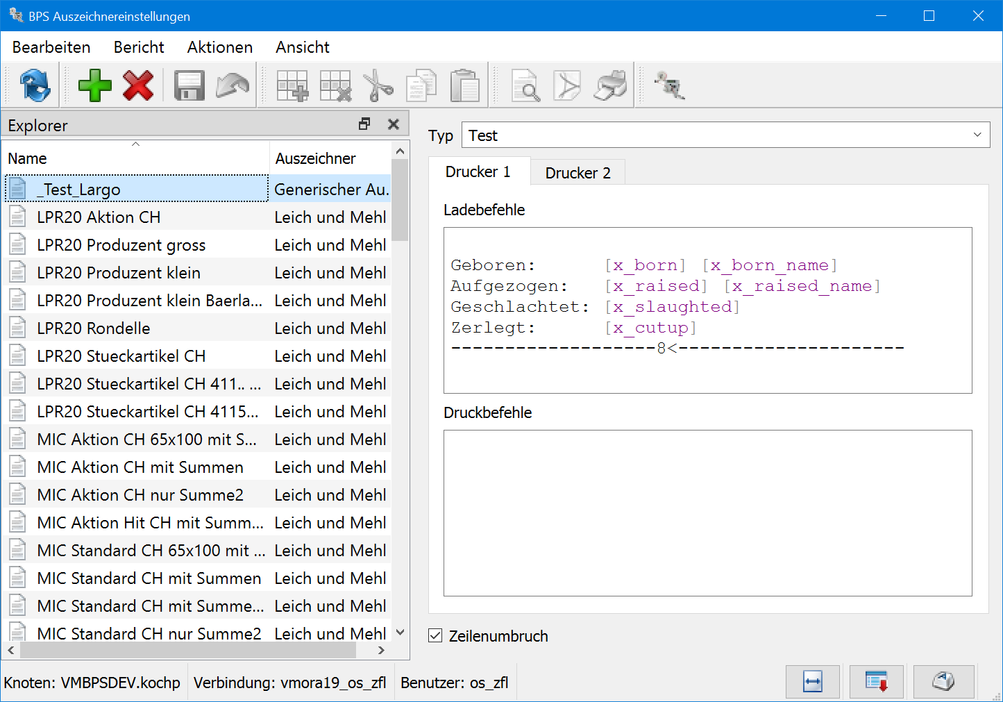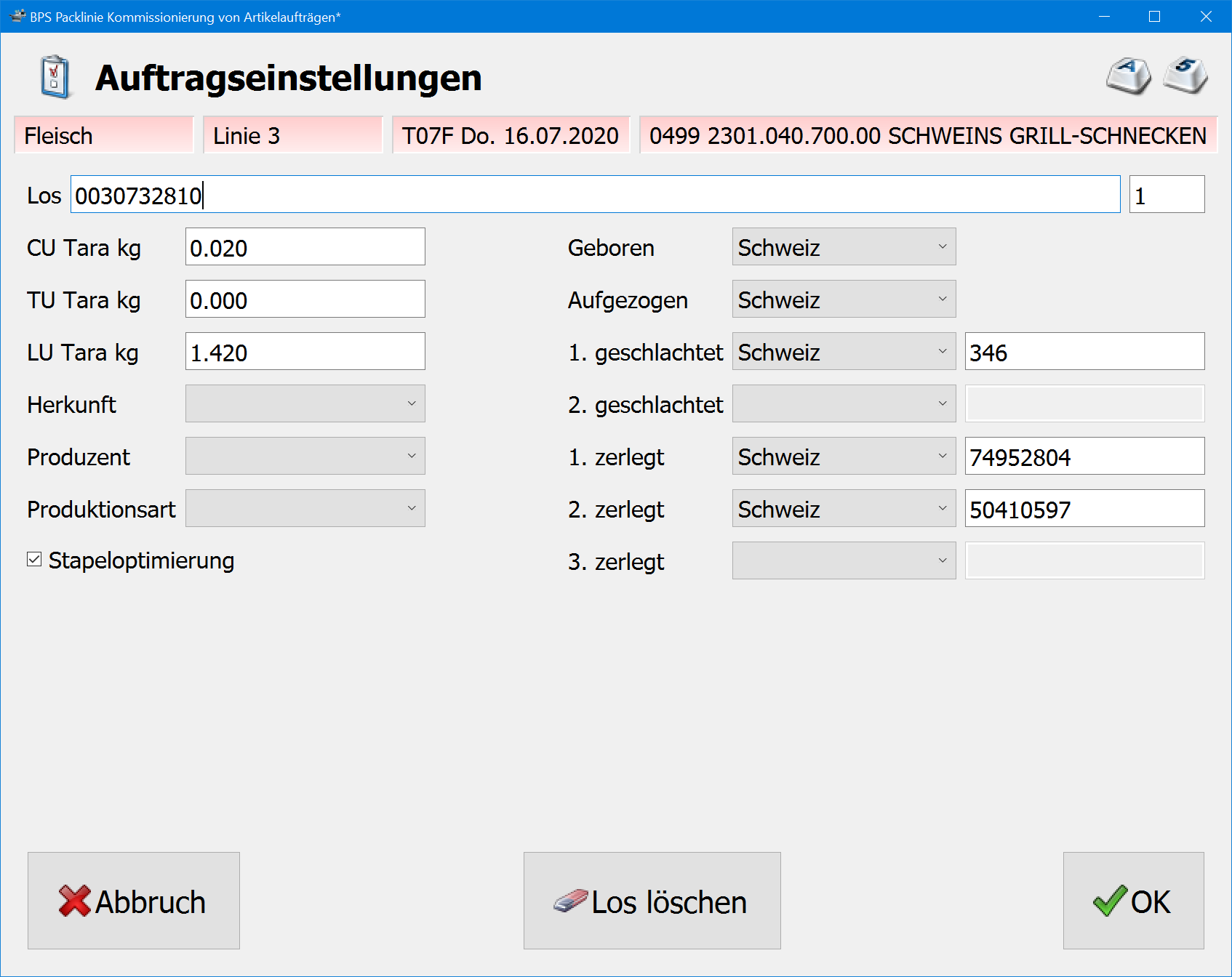 | Beschreibung | Die Herkunftsdeklarationen welche vom Gesetzgeber im Largo-Paket festgelegt wurden müssen in der Fleischproduktion, insbesondere bei der Preisauszeichnung umgesetzt werden. Die erforderlichen Daten werden zukünftig in der RüVeLo-Lösung zusammengestellt und als Datamatrix-Barcode auf der Losetikette gespeichert. Das BPS Programm «Packen und kommissionieren von Artikelaufträgen» wurde erweitert sodass die Largo-Daten durch scannen der RüVeLo-Etikette eingelesen, oder alternativ auch manuell eingegenben werden können. Zur Aktivierung der Largo Erfassung ist das Artikelattribut LARGO1 oder LARGO2 den entsprechenden Artikeln zuzuordnen. LARGO1 prüft ob bei «geschlachtet» und «zerlegt» jeweils eine Betriebsnummer erfasst ist, bei LARGO2 dürfen die Betriebsnummern auch fehlen. In beiden Varianten müssen Eingaben bei «geboren», «aufgezogen», «1. geschlachtet» und «1. zerlegt» erfasst sein: (Bild 1) Es können auch mehrere Losetiketten gescannt werden, solange die Largo-Informationen den bereits vorhandenen Daten nicht wiedersprechen oder die abweichenden Daten noch in den bisher unbenutzten Feldern platz haben. Ist das nicht möglich wird nach dem Scannen eine entsprechende Fehlermeldung angezeigt: (Bild 2) Mit Button «Los löschen» werden nicht nur die Losnummern, sondern auch alle Largo-Daten gelöscht. Wenn also das Einscannen eines weiteren Loses wegen Konflikt fehlschlägt, kann man anschliessend «Los löschen» betätigen und das neue Los erneut scannen. Preisauszeichnung Hat sich in den Einstellungen etwas an den Largo-Daten verändert, so werden die Daten nach «OK» frisch an den Preisauszeichner geschickt. In den Auszeichnereinstellungen stehen neue Platzhalter zur Verfügung mit denen die erfassten Largo-Daten in die Etikettierung integriert werden können: (Bild 3) Beispielausgabe: (Bild 4) Datenspeicherung Bei der Registrierung jedes Gebindes werden die aktuellen Largo-Einstellungen in den Pickdaten festgehalten. Die Daten selber werden auf Ebene des Artikelauftrags in der neuen Tabelle t_largodats gespeichert. In den einzelnen Pickdatensätzen wird nur eine Referenz auf den entsprechenden Datensatz in t_largodats gespeichert: (Bild 5) (Bild 6) Die Largo-Daten stehen somit auch für spätere Recherchen und Reports zur Verfügung. | ||||