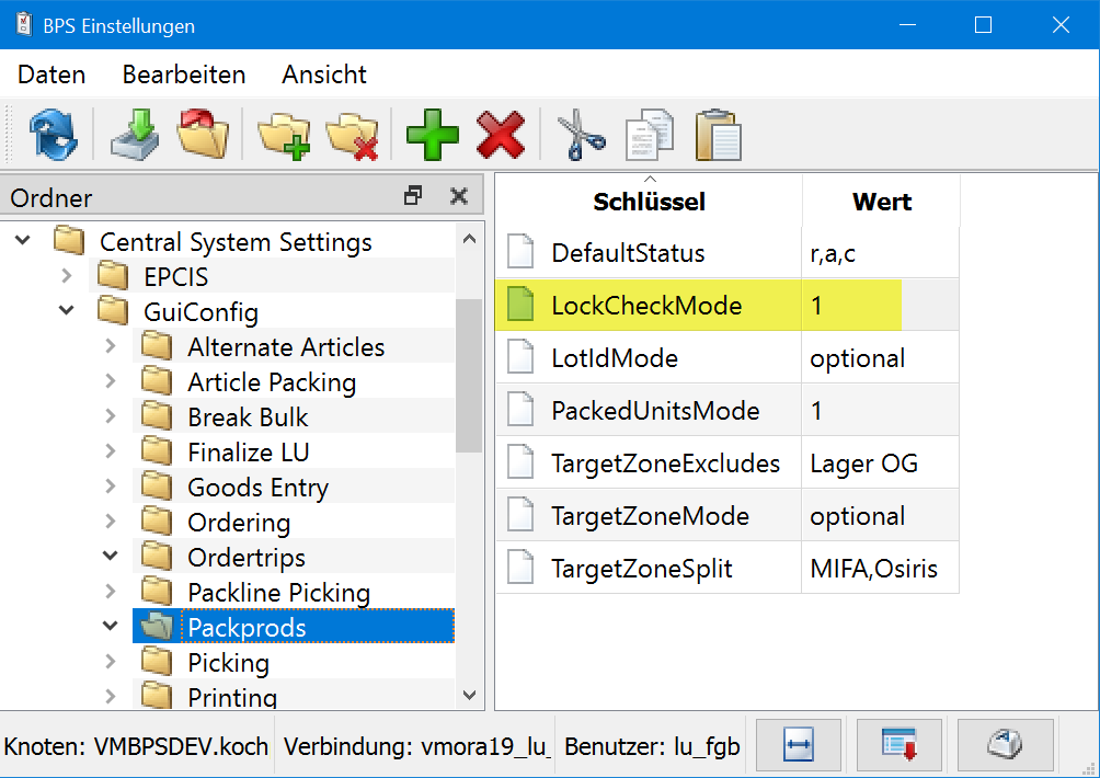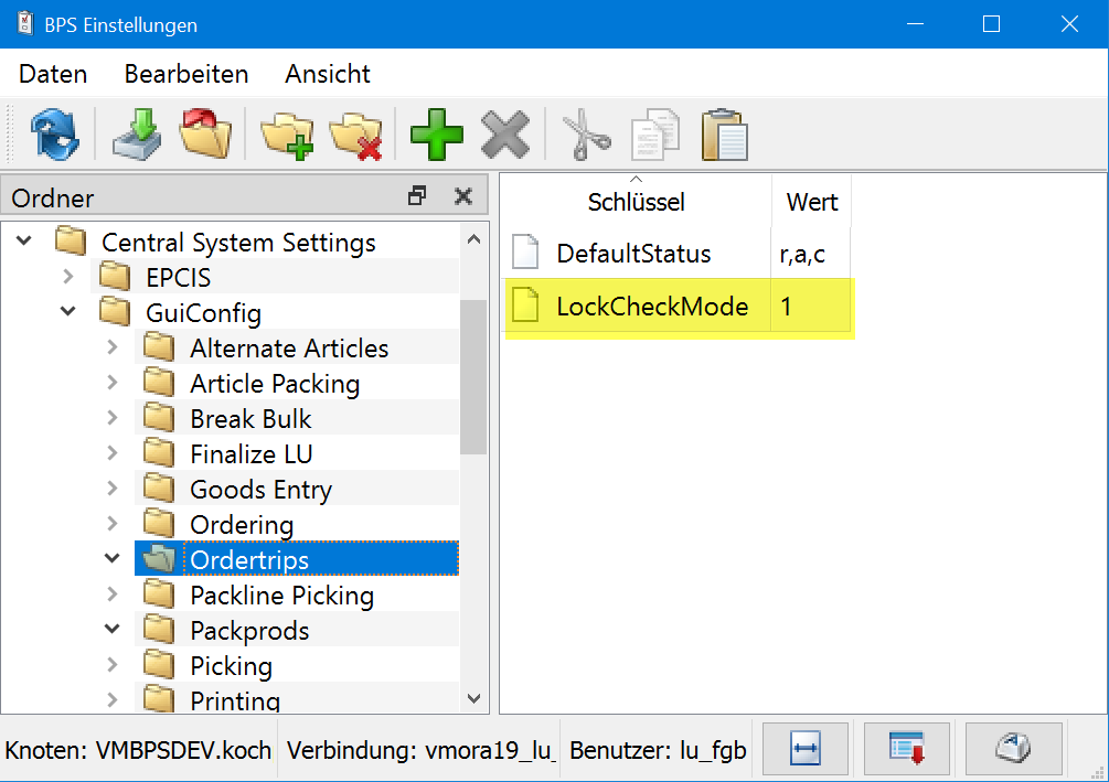 | Beschreibung | In den Auftragstouren und den Packaufträgen kann jetzt die Berücksichtigung der aktuell bearbeiteten (gesperrten) Objekte eingestellt werden. Ab 2.24.0.0 wurden diese immer berücksichtigt, was dazu führte dass z.B. eine Kürzung, ein Tourenabschluss oder eine Aktualisierung einer Packproduktion nicht möglich war solange jemand am Kommissionieren war, resp. solange eine Linie am Abpacken war. Neu kann das Verhalten mit der Einstellung LockCheckMode wie folgt eingestellt werden: