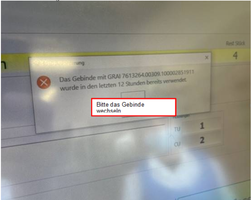 | Beschreibung | Wird derselbe GRAI Code beim Packen innert der letzten X Stunden wieder verwendet, so wird eine entsprechende Fehlermeldung angezeigt. Diese Meldung soll ergänzt werden mit dem Nachsatz "Bitte das Gebinde wechseln." | ||||