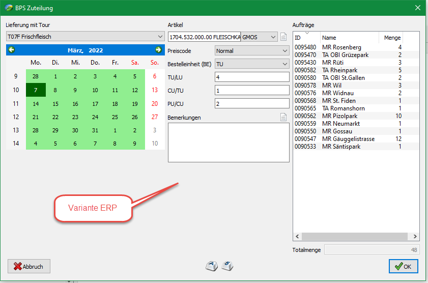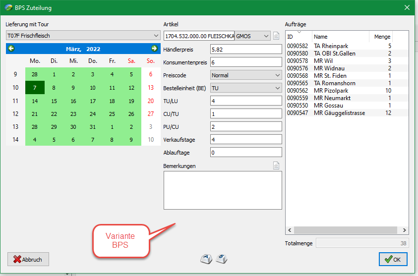| Beschreibung | Es wurde eine neue Funktion eingebaut mit der man, ausgehend von bestehenden Bestellungen in einer Auftragstour, eine neue Zuteilung erfassen kann. Ähnlich wie z.B. bei der Kürzungsfunktion kann eine oder mehrere Positionen desselben Artikels markiert werden um daraus eine neue Zuteilung zu erstellen. Auch ein oder mehrere ganze Artikelaufträge des gleichen Artikels können selektiert werden um eine neue Zuteilung zu erstellen. In der Funktion kann dann die Liefertour mit Datum gewählt werden, der Artikel ggf. geändert und/oder diverse Parameter des Artikelauftrags angepasst werden. Schliesslich werden auch die originalen Sollmengen aller Partner als Liste angezeigt und können bei Bedarf direkt editiert werden. Die editierbaren Artikelauftragsparameter unterscheiden sich, je nachdem ob man die neuen Aufträge direkt in BPS erstellt oder Bestellungen via ERP generiert. Bei ERP werden die Parameter Händlerpreis, Konsumentenpreis, Verkaufstage und Ablauftage nicht angeboten, da diese bei ERP Bestellungen nicht übergeben werden können, sondern durch das ERP bestimmt respektive beim KO10 Import in BPS vom Artikelstamm übernommen werden. | ||||