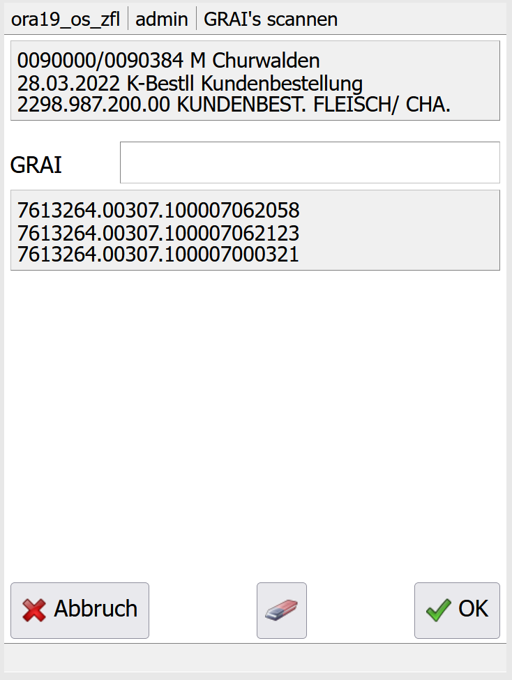 - Wenn EPCIS in BPS aktiviert ist (1), dann erscheint nach der Registrierung ein neues Bild wo die GRAI Codes der verwendeten Gebinde erfasst werden können. Der GRAI kann entweder vom EPC Tag auf dem Gebinde eingescannt werden, oder alternativ eingetippt werden und mit Enter/OK bestätigt werden (Eingabe als Ziffern des Barcodes, z.B. 800307613264003071100007062058). Die bereits erfassten GRAI werden unterhalb des Eingabefelds im EPCIS Format angezeigt. Sobald alle GRAI der Gebinde erfasst sind, wird bei leerem Eingabefeld mit OK bestätigt um die Erfassung abzuschliessen.