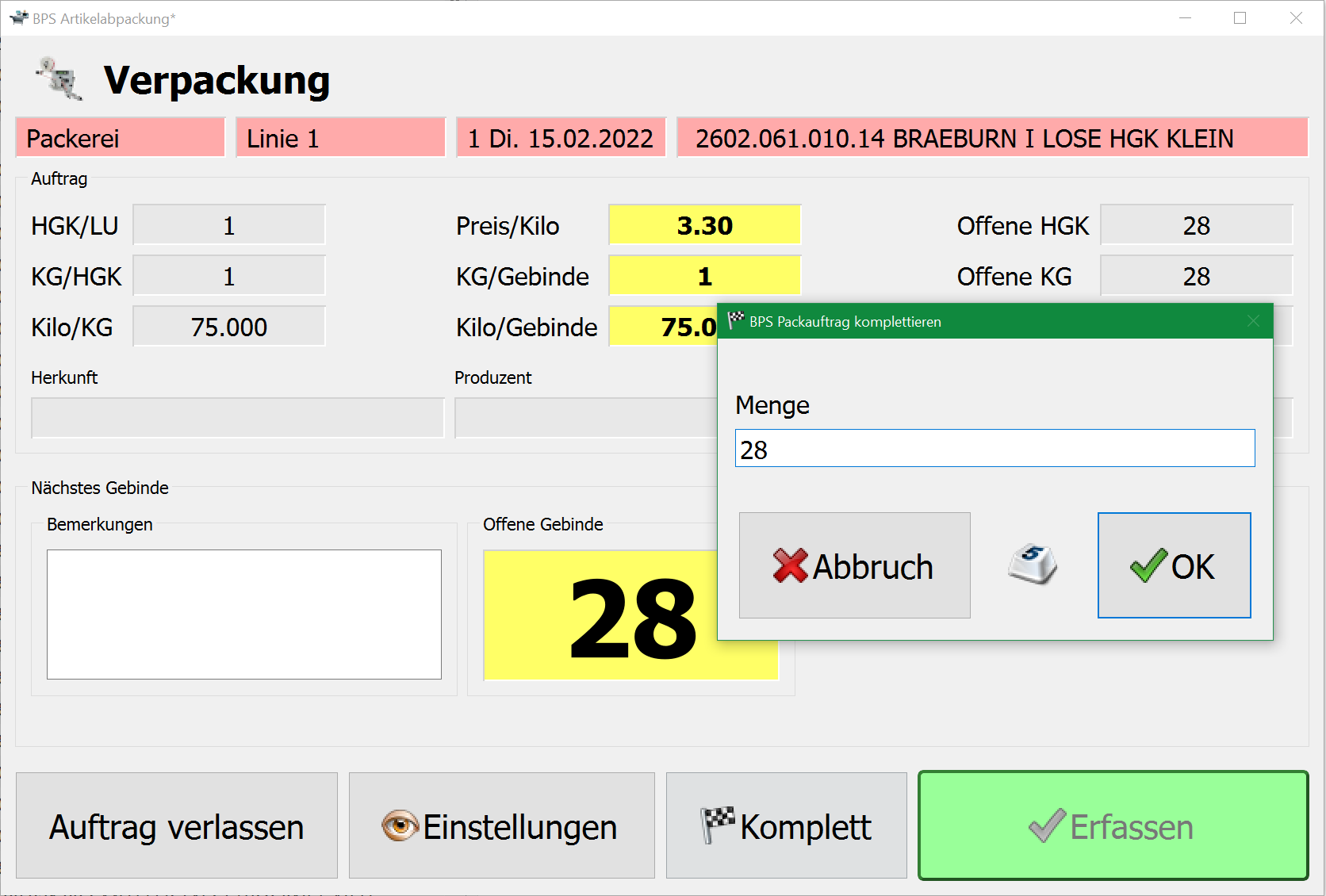 | Beschreibung | Im Programm Artikelabpackung soll im Bild "Verpackung" ein zusätzlicher Button "Komplett" eingebaut werden. Damit wird ein Dialog-Fenster aufgerufen in welchem die noch offene Menge an Gebinden in einem Eingabefeld angezeigt wird (siehe Bild). Die vorgeschlagene Menge kann dort ggf. korrigiert und dann mit "OK" bestätigt werden. Die entsprechende Anzahl Gebinde werden dann registriert. Falls die dann total registrierte Anzahl Gebinde dann noch kleiner ist als die vorgegebene Sollmenge, wird die Sollmenge des Auftrags entsprechend reduziert damit der Auftrag als abgeschlossen erscheint. Der Auftrag wird schliesslich geschlossen und es erscheint wieder das Bild "Auftragsauswahl". | ||||